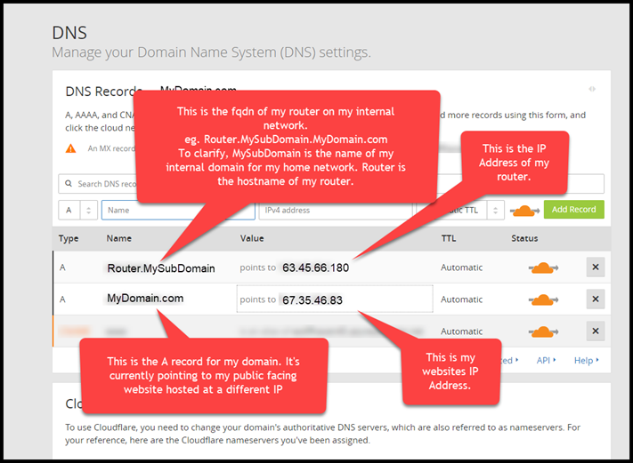 So for starters, I created a CloudFlare account (for free!). I then changed the Nameservers I was using for my domain over to CloudFlare’s Nameservers (this took around 24 hours to validate). I then setup an A record for my router.
