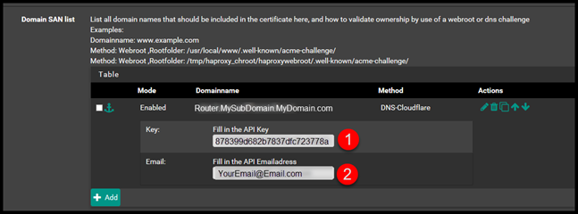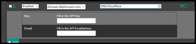 Then, go back to pfSense select Add. Then fill out the Domain Name and then select DNS-Cloudlfare for the method.