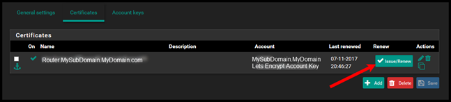 Now go back to the certificates tab and then select Issue / Renew. This will attempt to create the certificate. This will take 2 minutes.