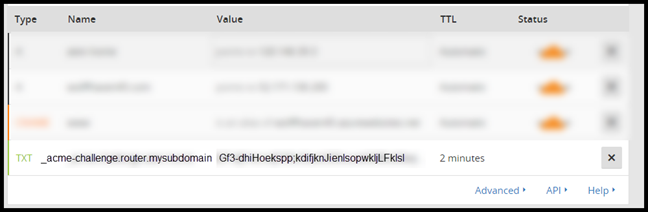 If you check out your DNS entries on CloudFlare while you wait you can see the TXT record that gets created to validate the DNS-01 challenge.