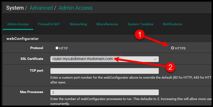 Go to System > Advanced > Admin Access and select the SSL Certificate. Select HTTPS and then select the SSL Certificate from the drop down menu.