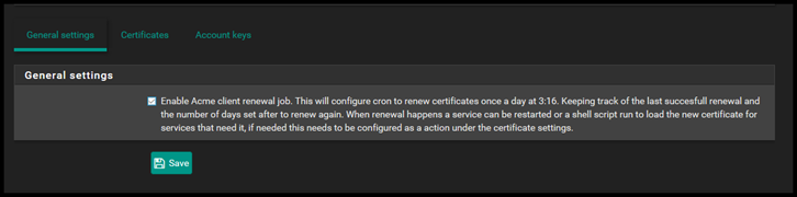 Now one last thing. These certificates only last for 3 months. However, you can configure automatic renewal. Go back and tick the enable acme client renewal job under General Settings.