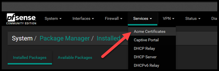 Okay, now that DNS is setup. Let’s turn our attention to Pfsense. Firstly, if you don’t have the Acme Package installed, you’re going to want to install that.