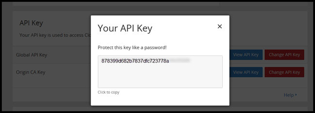 Grab your API Key from CloudFlare. Navigate to Overview > Domain Summary > Get your API Key. Then Select View API Key.