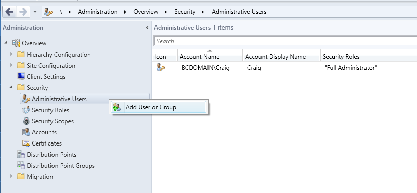 Now in the SCCM console, navigate to Administration > Security > Administrative Users. Right click Administrative Users and click Add User or Group.