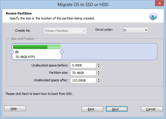 This next screen will show you the size of the new Windows Partition after the migration has taken place, you can increase the size if you would like to have some more free space then what you currently have.